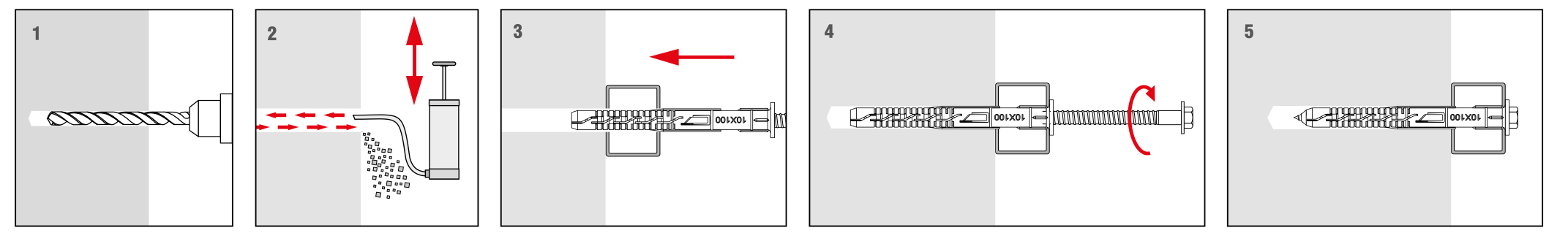 - Należy dobrać odpowiednią długość łącznika, tak aby strefa rozporowa znajdowała się w materiale konstrukcyjnym ściany (grubość elementu mocowanego odpowiada max. długości użytkowej łącznika).