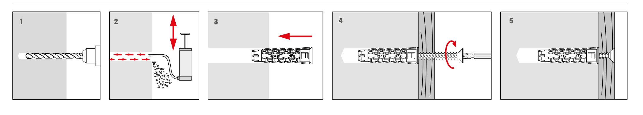 - Następnie do otworu wprowadzana jest tworzywowa koszulka, a wkręt jest wkręcany poprzez element mocowany aż do momentu zagłębienia się w koszulce (montaż wstępny).