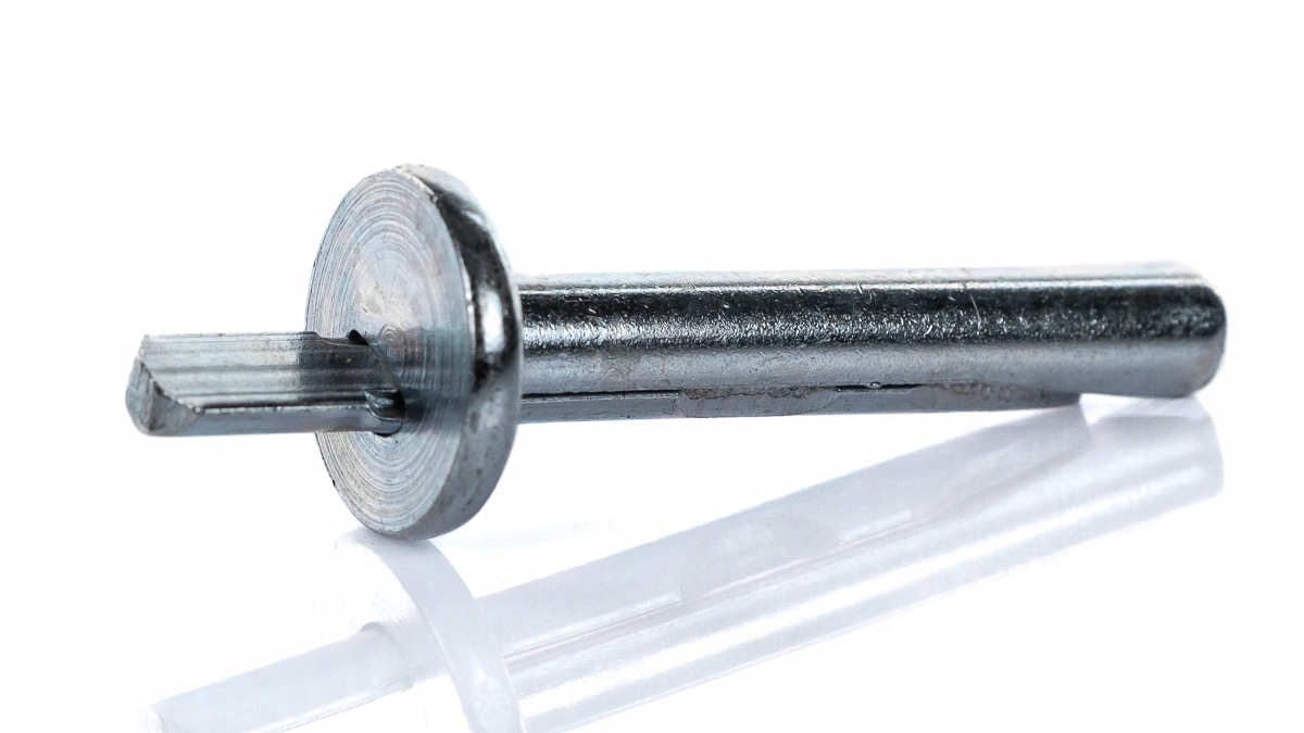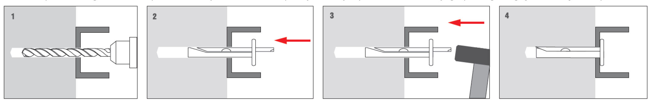 - Do wywierconego otworu wprowadzana jest kotwa, a trzpień jest wbijany aż do momentu jego pełnego zagłębienia się w korpusie.