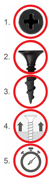 Specjalny profil gwintu minimalizujący czas wkręcenia: 2,5 raza krótszy czas wkręcania od wymagań normy.