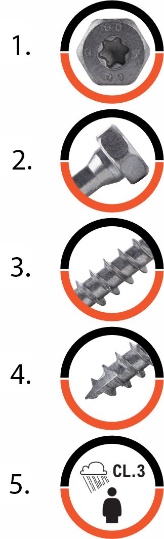 Wkręty konstrukcyjne do drewna i złączy ciesielskich z pełnym lub częściowym gwintem i sześciokątną główką oraz dodatkowym gniazdem gwiazdkowym TX.