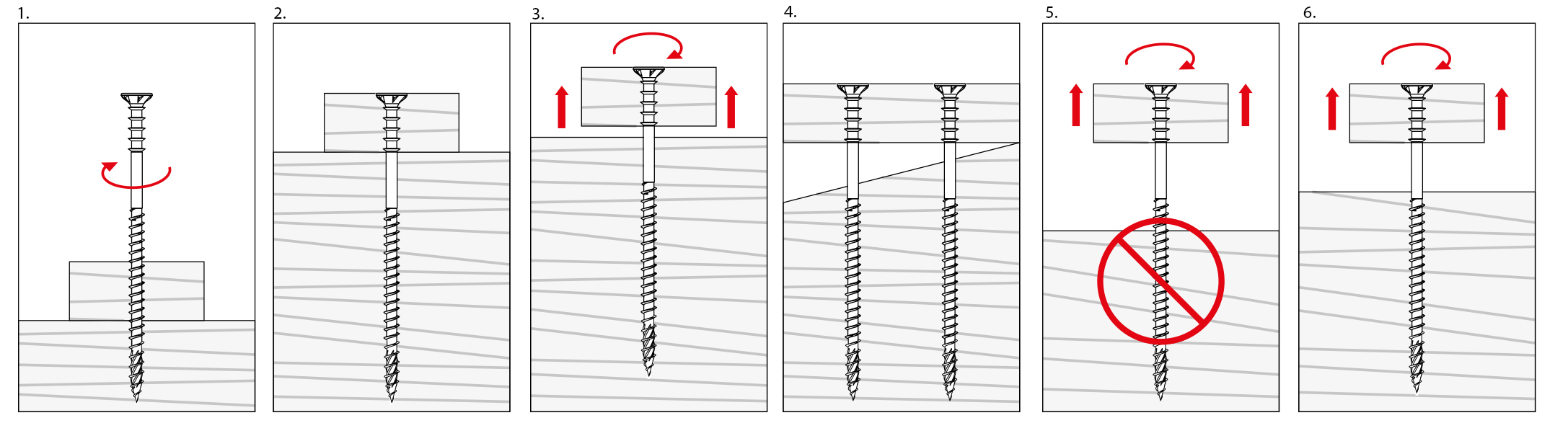 Wkręty mają dwie odmienne strefy profilowania trzpienia. Pierwszy z nich to klasyczny ostry gwint do drewna z ostrym szpicem, drugi to specjalne pierścienie, które przytrzymują mocowany element, dzięki czemu możemy regulować różnice w odległościach pomiędzy elementami.