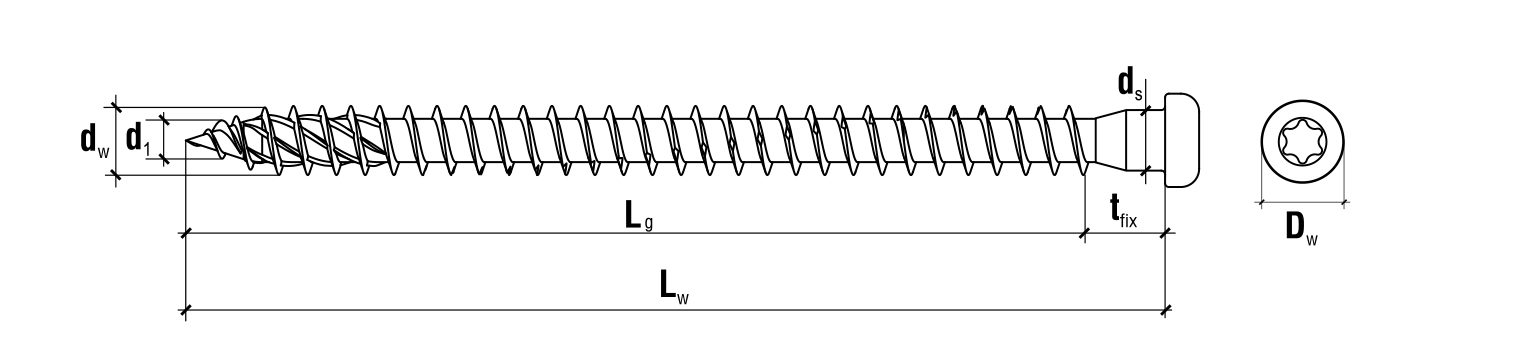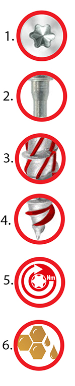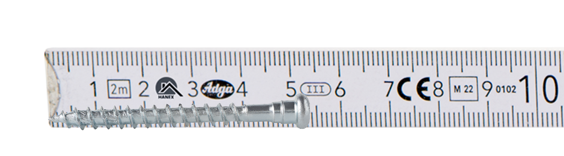 Poszerzona średnica wkręta pod łbem zwiększa wytrzymałość wkręta na ścinanie oraz zapewnie idealne dopasowanie do otworów znajdujących się w złączach ciesielskich. Początkowo sfazowana część pod łbem zapewnia bezproblemowe osadzenie wkręta w otworze.
