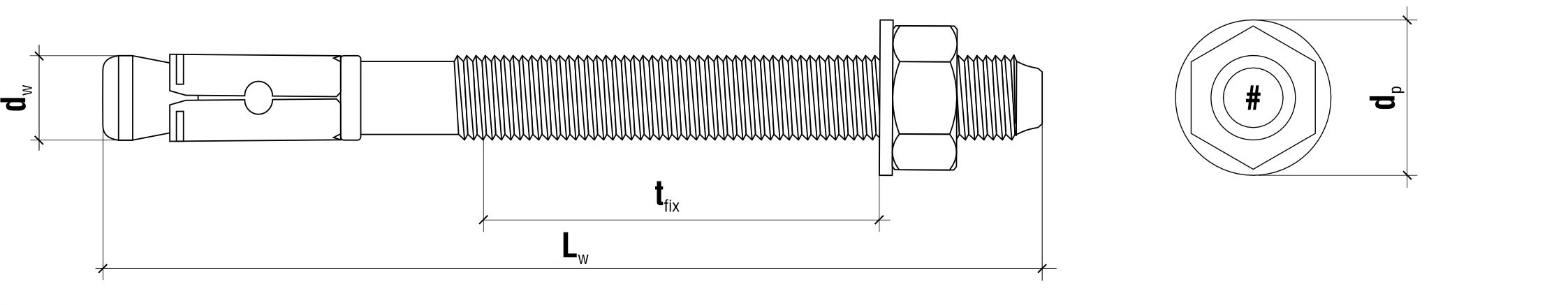 - Dokręcić nakrętkę odpowiednim momentem dokręcającym (Tinst) przy użyciu klucza dynamometrycznego. Podczas dokręcania śruba naciska na klips rozporowy, co powoduje jego docisk do ścianek wierconego otworu. Należy zwrócić uwagę, aby po rozprężeniu kotwy podkładka pod nakrętką była dociśnięta do mocowanego elementu.