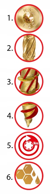 Innowacyjna konstrukcja wkrętów sprawia że praca z nimi to czysta przyjemność. Nie wymagają wcześniejszego nawiercania. Głębokie i stabilne gniazdo TORX efektywnie przenosi moment obrotowy bez efektu wyskakującego bita.