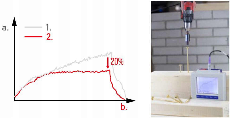 W badaniach prowadzonych przed wdrożeniem produktu potwierdziliśmy, że nowy kształt końcówki wkręta powoduje skrócenie czasu wkręcania nawet o 40% przy tym samym obciążeniu. Oszczędność uzależniona jest od rodzaju połączenia i zastosowanego drewna.