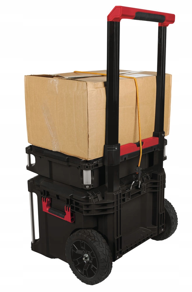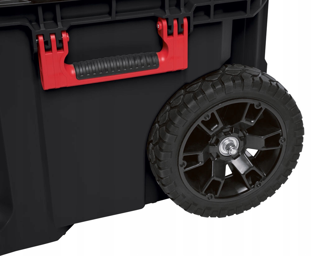 - Duże gumowe koła ułatwiające bezproblemowe przemieszczenie skrzyni po różnych podłożach nawet schodach,