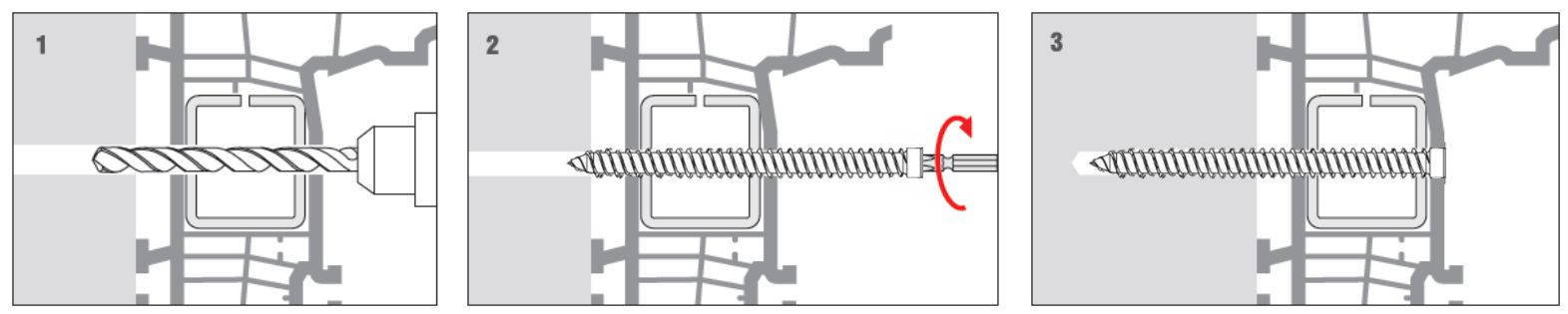 Dzięki gwintowi na całej długości wkręta, ościeżnica utrzymywana jest w ustalonym położeniu przy zachowaniu dystansu. Technika wkręcania bezpośrednio w przygotowany wstępny otwór dwukrotnie przyspiesza montaż w porównaniu do tradycyjnych kotew rozporowych. Brak naprężeń rozpierających sprawia, że można go stosować blisko krawędzi.