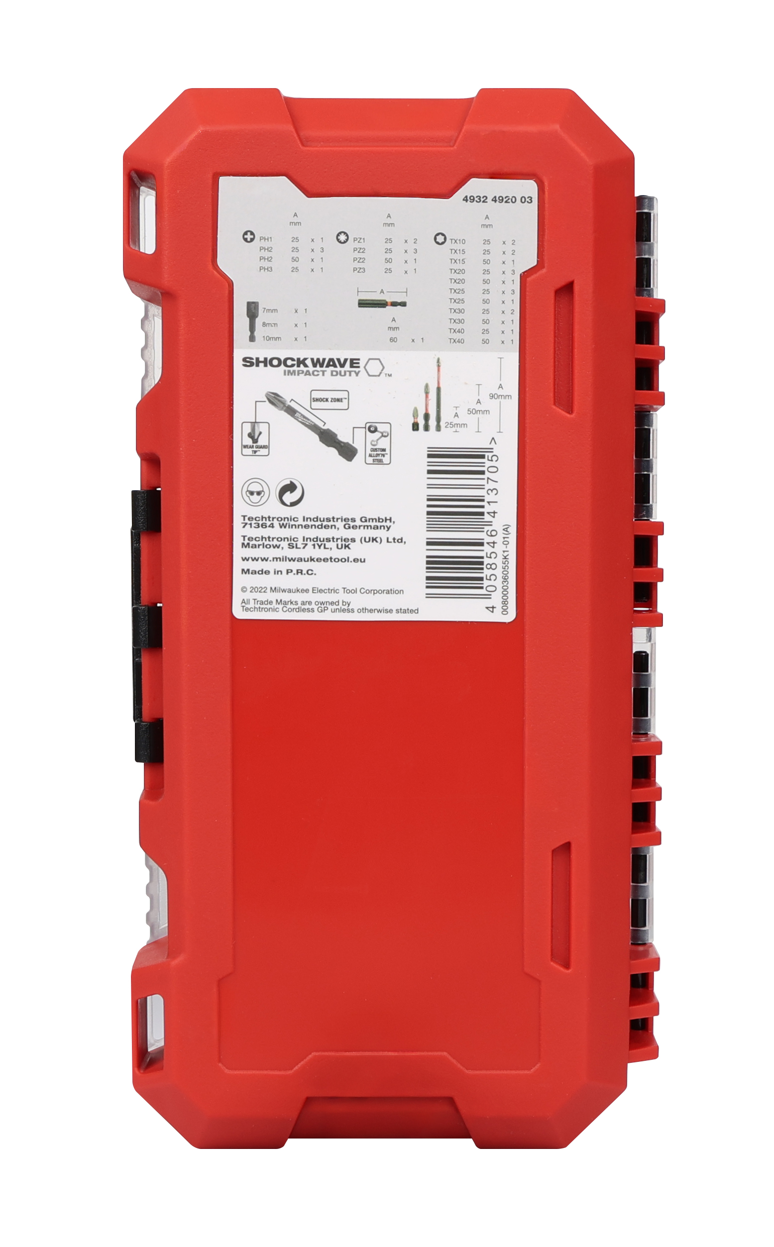- Rozmiar: Bity udarowe SHOCKWAVE™: 24 x 25 mm długości 1 x PH1 / 3 x PH2 / 1 x PH3, 2 x PZ1 / 3 x PZ2 / 1 x PZ3, 2 x TX10 / 2 x TX15 / 3 x TX20 / 3 x TX25 / 2 x TX30 / 1 x TX40. 7 x 50 mm długości 1 x PH2 / 1 x PZ2, 1 x TX15 / 1 x TX20 / 1 x TX25 / 1 x TX30 / 1x TX40. 3 x Udarowa magnetyczna nasadka sześciokątna: 48 mm długości 1 x Hex 7 mm / 1 x Hex 8 mm / 1 x Hex 10 mm. 1 x magnetyczny uchwyt bitów SHOCKWAVE™ 60 mm