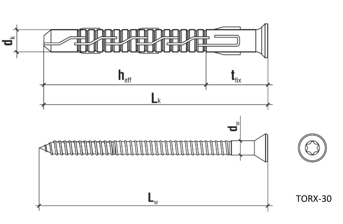 Składa się z koszulki wykonanej z poliamidu oraz wkręta wykonanego ze stali ocynkowanej z łbem stożkowym oraz gniazdem TX.