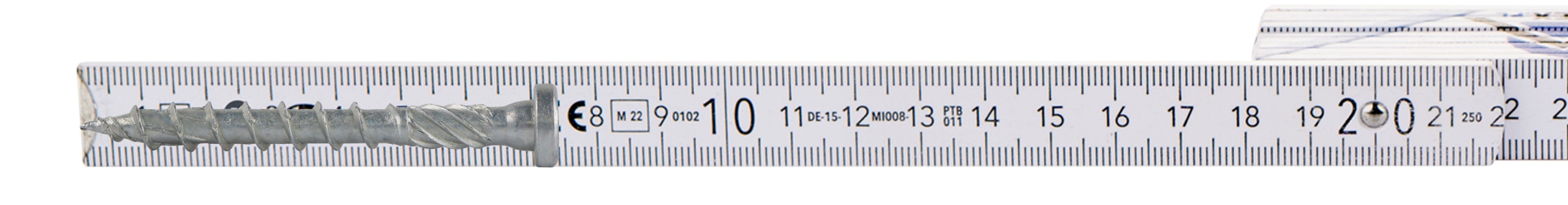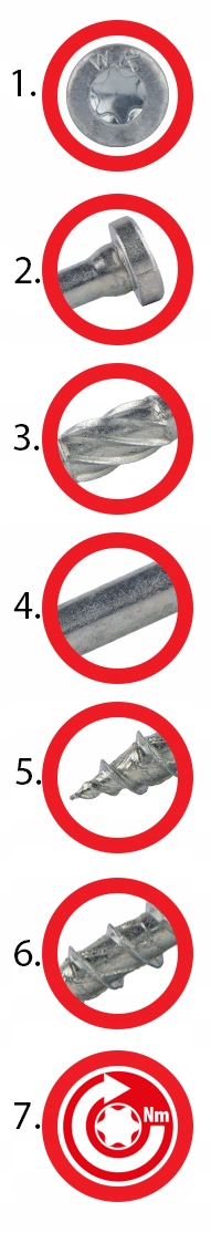 Poszerzona średnica wkręta pod łbem zwiększa wytrzymałość na ścinanie oraz zapewnia idealne dopasowanie do otworów znajdujących się w złączach ciesielskich. Początkowo sfazowana część pod łbem zapewnia bezproblemowe osadzenie wkręta w otworze.