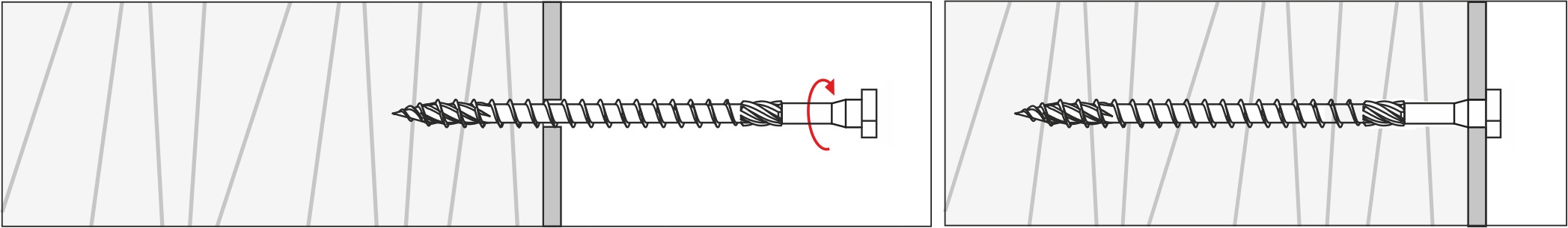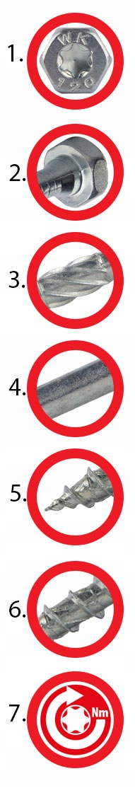 Poszerzona średnica wkręta pod łbem zwiększa wytrzymałość na ścinanie oraz zapewnia idealne dopasowanie do otworów znajdujących się w złączach ciesielskich. Początkowo sfazowana część pod łbem zapewnia bezproblemowe osadzenie wkręta w otworze.