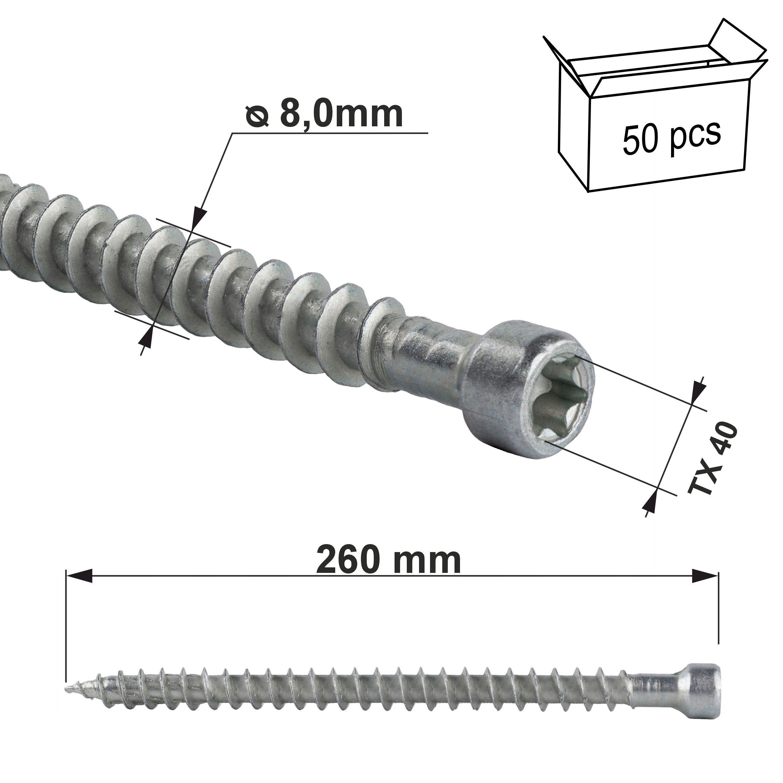 Wkręty ciesielskie 8x260 mm 50 szt. torx pełny gwint walcowe Klimas WKFC