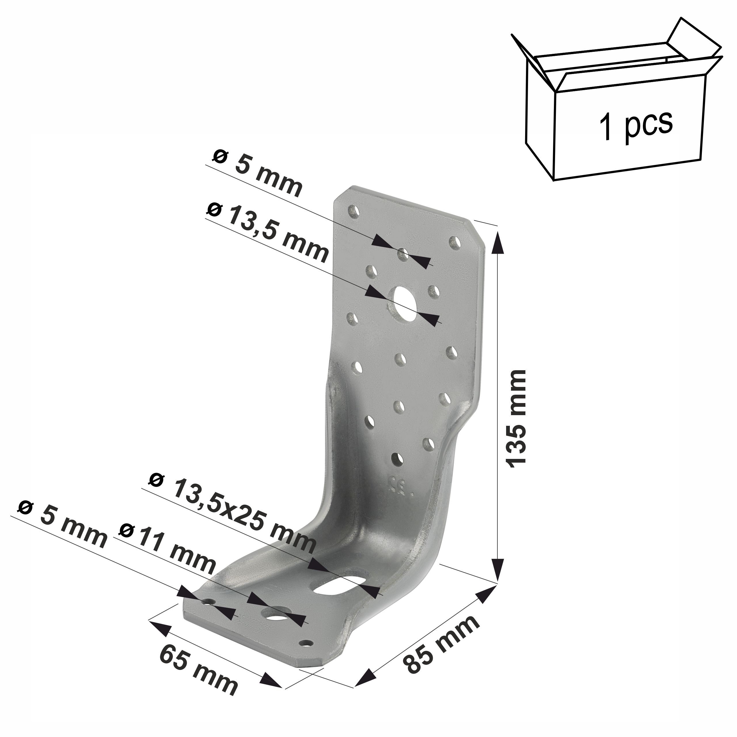- Otwory ramię B: 2 szt. x Ø 5 mm, 1 szt. x Ø 11 mm, 1 szt. x Ø 13,5 mm x 25 mm