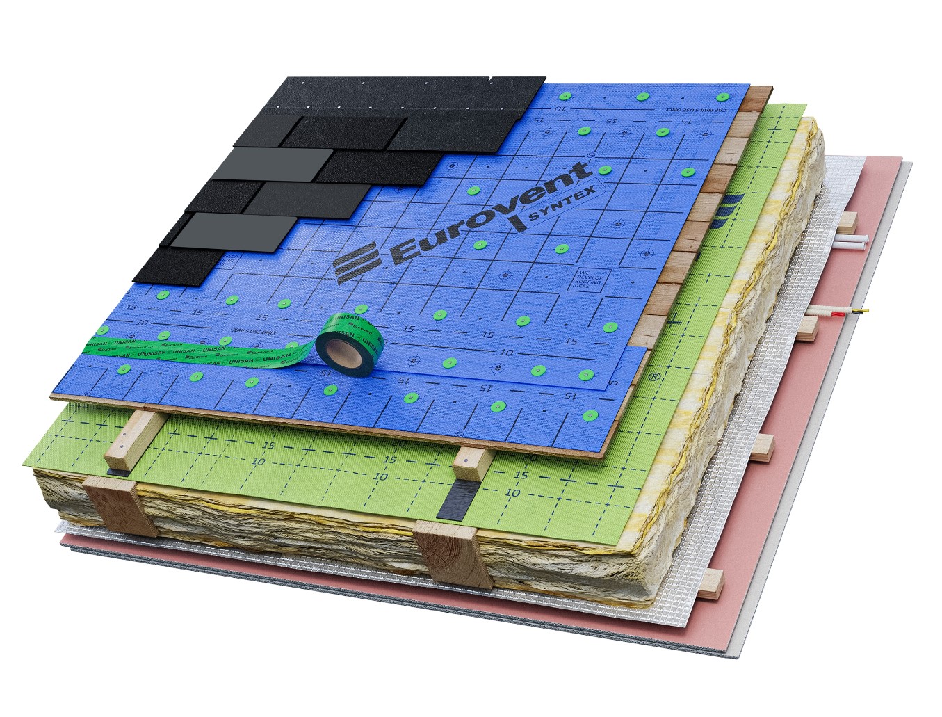 - Membrana dachowa Eurovent Syntex, wodoszczelna, syntetyczna, niskoparoprzepuszczalna.