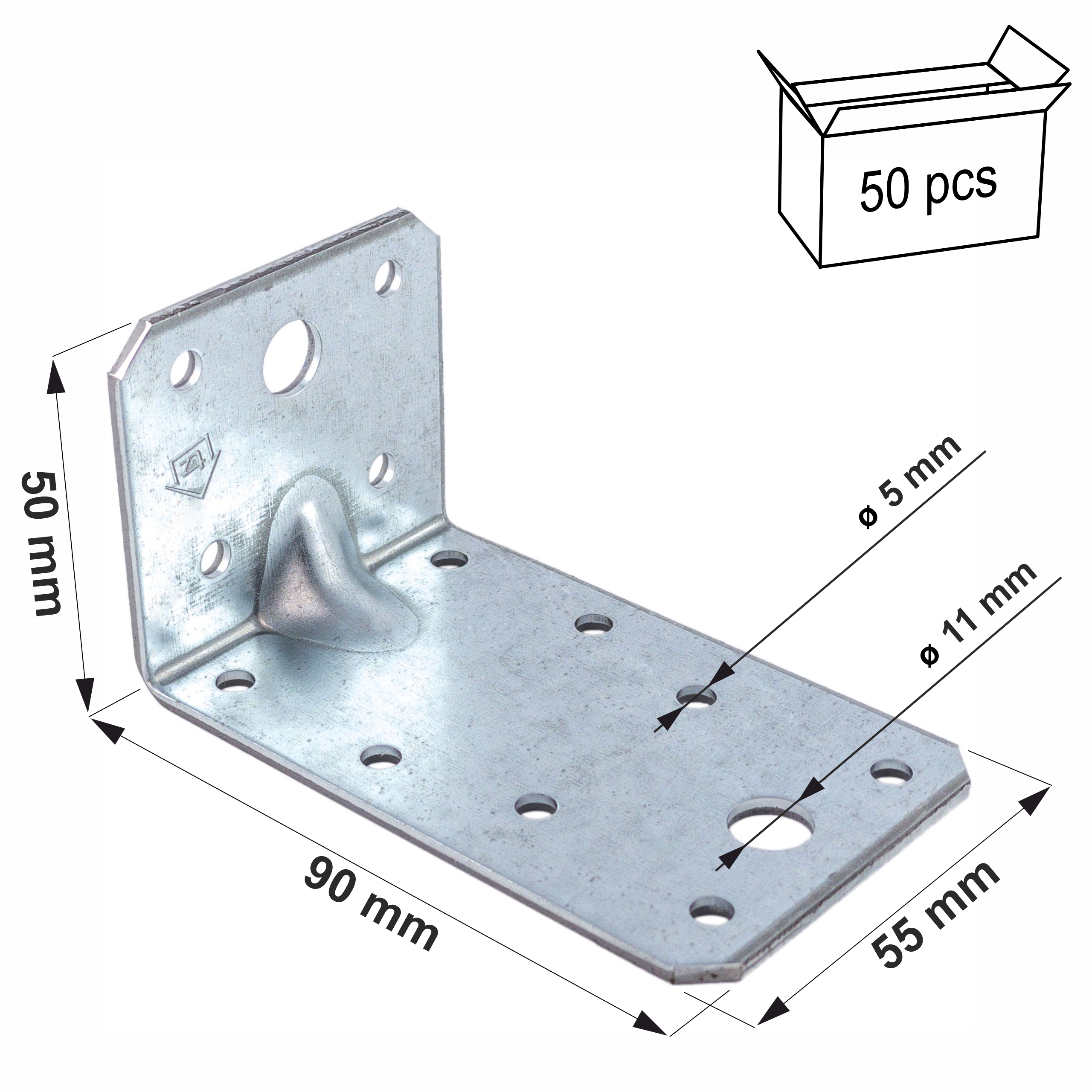 Opinie o Kątowniki ciesielskie stalowe 90x50x55x2,5mm 50 szt. perforowane wzmoc. KP3