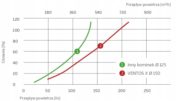 Wykres przedstawia porównanie przepływu powietrza przez kominek wentylacyjny o średnicy 125 oraz 150 mm.