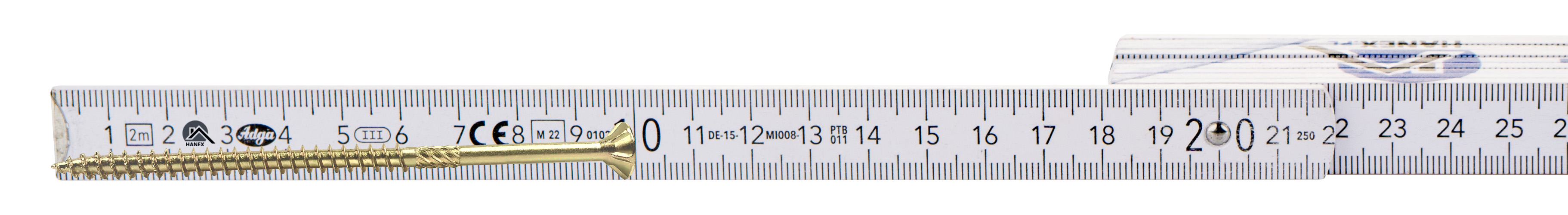 • Wkręty konstrukcyjne wykonane ze stali ocynkowanej posiadają łeb stożkowy z gniazdem typu TX oraz specjalną końcówkę wiercącą przeznaczoną do połączeń w konstrukcjach drewnianych.