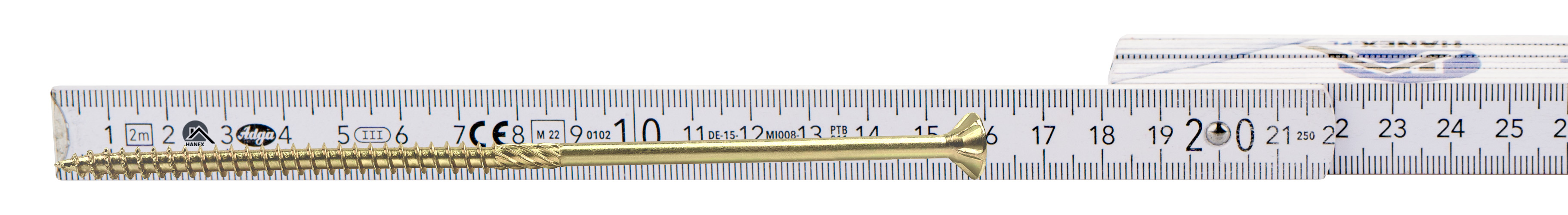 • Wkręty konstrukcyjne wykonane ze stali ocynkowanej posiadają łeb stożkowy z gniazdem typu TX oraz specjalną końcówkę wiercącą przeznaczoną do połączeń w konstrukcjach drewnianych.