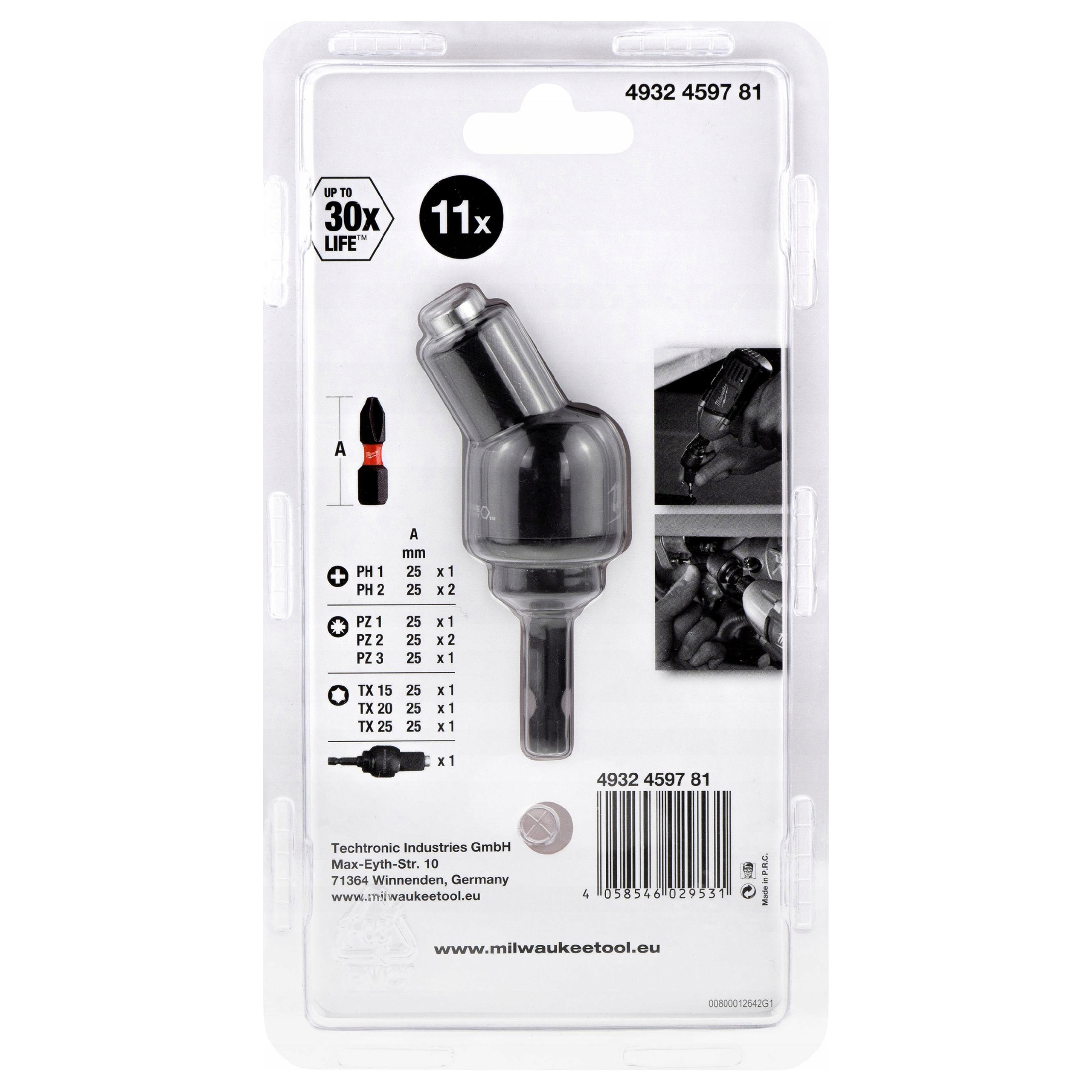 - 1 x PH1, 2 x PH2, 1 x PZ1, 2 x PZ2, 1 x PZ3, 1 x TX15, 1 x TX20, 1 x TX25.