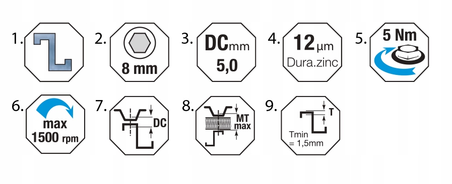 - Zalecana prędkość obrotowa podczas montażu wkrętów: 1500 obr/min