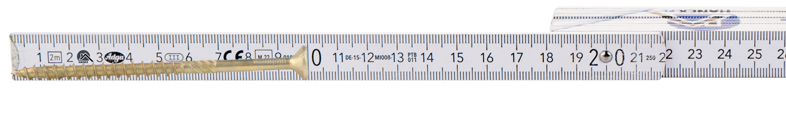 - Wkręty konstrukcyjne wykonane ze stali ocynkowanej posiadają łeb stożkowy z gniazdem typu TX oraz specjalną końcówkę wiercącą przeznaczoną do połączeń w konstrukcjach drewnianych.