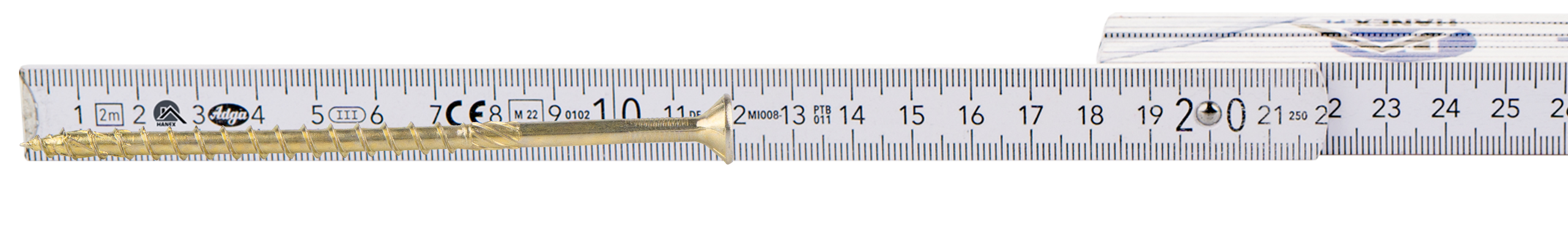 - Wkręty konstrukcyjne wykonane ze stali ocynkowanej posiadają łeb stożkowy z gniazdem typu TX oraz specjalną końcówkę wiercącą przeznaczoną do połączeń w konstrukcjach drewnianych.