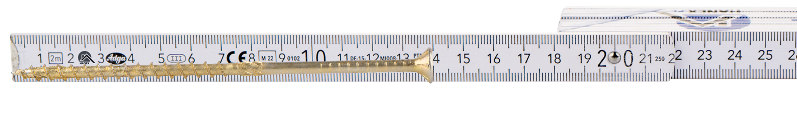 - Wkręty konstrukcyjne wykonane ze stali ocynkowanej posiadają łeb stożkowy z gniazdem typu TX oraz specjalną końcówkę wiercącą przeznaczoną do połączeń w konstrukcjach drewnianych.