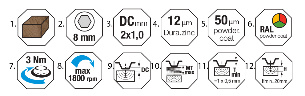 - Zalecana prędkość obrotowa podczas montażu wkrętów: 1800 obr/min