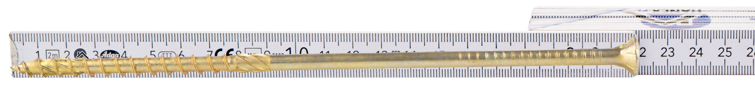 - Wkręty konstrukcyjne wykonane ze stali ocynkowanej posiadają łeb stożkowy z gniazdem typu TX oraz specjalną końcówkę wiercącą przeznaczoną do połączeń w konstrukcjach drewnianych.