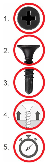 Wkręty samowiercące do mocowania płyt g-k wykonane są ze stali węglowej pokrytej specjalną powłoką fosfatową. Wkręty posiadają łeb stożkowy płaski, który zapewnia odpowiednie zagłębienie w mocowanym elemencie oraz gwint do stali zakończony ostrą końcówką samowiercącą, która umożliwia przewiercanie blach o gr. do 2,50 mm. Łeb wkręta posiada wgłębienie typu PH-2, co umożliwia montaż przy użyciu końcówek z ogranicznikiem głębokości kotwienia.