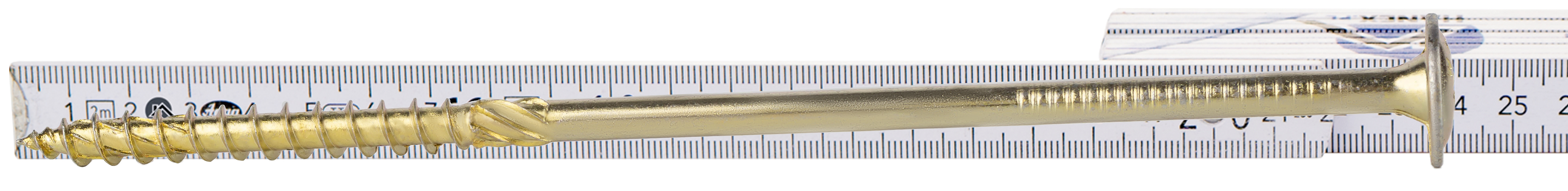 Wkręty konstrukcyjne wykonane ze stali ocynkowanej posiadają łeb podkładkowy z gniazdem typu TX oraz specjalną końcówkę wiercącą przeznaczoną do połączeń w konstrukcjach drewnianych.