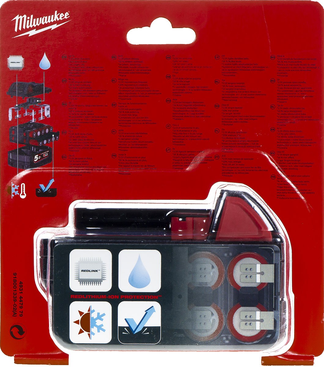 Zapewnia 2,5 razy dłuższy czas pracy, o 20% większą moc i 2 razy większą trwałość użytkową w porównaniu z innymi technologiami litowo-jonowymi i/lub poprzednimi technologiami akumulatorów Milwaukee®. (Wyniki zależą od narzędzia i zastosowania)